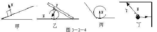 解析:本题要排除二个干扰,一是地面的弹力就是B点的支持力;二是A点有没有弹力,在A点球虽然与墙壁接触但相互间没有挤压,所以在A点没有弹力。那么怎么样判断A点没有相互挤压的呢?我们可以用假设法,设想A处的墙壁撤消,球仍然保持静止状态,所以在A处没有弹力。