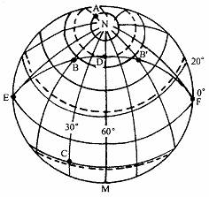 我们讨论一下任意一点C地的日出日落方位,作过C地的纬线,找出该纬线与晨线的交点D、与昏线的交点D",可以看出,太阳光线相对于D地来说来自东北方向;相对于D"地来说来自西北方向,所以,在C地太阳从东北方向升起,从西北方向落下。