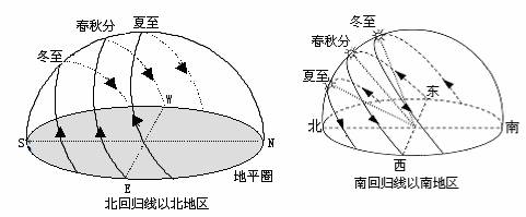 总结规律为:太阳直射南半球时,全球各地除了极昼、极夜地区以外,太阳都是从东南方向升起,从西南方向落下,而且太阳直射点的纬度越接近南回归线,各地日出、日落的方位越偏南;纬度越高的地方日出日落的方位也越偏南。