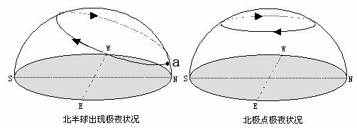 总结规律为:太阳直射北半球时,全球各地除了极昼、极夜地区以外,太阳都是从东北方向升起、从西北方向落下,而且太阳直射点的纬度越接近北回归线,各地日出、日落的方位就越偏北;纬度越高的地方日出日落的方位也越偏北。