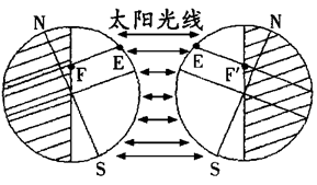 在晨线上看到的是日出,在昏线上看到的是日落。在上图中,选任意一点A,我们来分析一下A地日出日落的方位。因为纬度相同的地方,日出日落的方位也相同,所以我们首先作过A地的纬线,找到该纬线与晨线的交点B、与昏线的交点B"。只要得出太阳光线相对于B地的方向,就可知道A地日出的方位;只要得出太阳光线相对于B"地的方向,就可知道A地日落的方位。可以看出,相对于B地而言,太阳光线来自正东方向,所以在A地太阳从正东方向升起;相对于B"地而言,太阳光线来自正西方向,所以在A地太阳从正西方向落下。