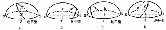 答案:B 点拨:由于太阳直射在南半球,北京应该是昼短夜长,且太阳在东南方向日出,西南方向日落。图A太阳视运动偏向错误,图B表示昼短夜长,且日出东南,日落西南。