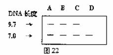 (2)若对I1、I2、II1、II2进行关于甲病的基因检测,将含有患病基因或正常基因的相关DNA片段(数字代表长度)进行分离,如果如图22(A、B、C、D代表上述个体)。个体D是系谱图中的 号个体。