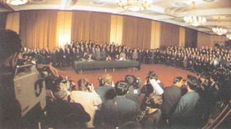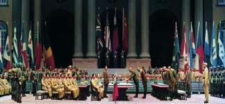图二:经过艰苦卓绝的抗战,中国人民终于取得了抗日战争的伟大胜利。图为1945年日本向中国政府投降的签字仪式。