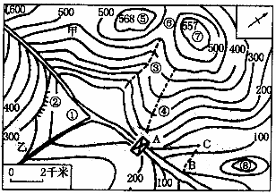 (4)小河流向 方。计划把水从A水库调到C处,有AC和BC两条路线,选择哪一条比较合理? 为什么?