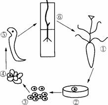 4.美国科学家将分离得到的成熟胡萝卜韧皮部细胞进行培养,由单个细胞发育成完整的新植株(如右图)。请据图回答: