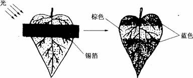 4.下图表示德国科学家萨克斯的实验,在叶片照光24 h后,经脱色、漂洗并用碘液处理,结果有锡箔覆盖的部分呈棕色,而不被锡箔覆盖的部分呈蓝色,本实验说明 ( )