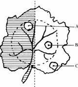 6.选一盆银边天竺葵(叶边缘呈白色),预先放在黑暗中生长48 h,再将整个叶片左侧用黑纸夹住,然后把天竺葵放在阳光下照4 h,再剪下此叶片,并用打孔器分别在该叶片的不同部位取下A、B、C三个圆片(如图所示),放在酒精中加热脱色,再放入清水中漂洗,取出后加碘液。请回答下列问题: