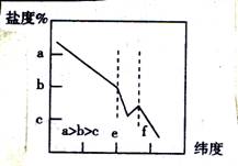 读“北半球某海区同一经度不同纬度海水盐度变化曲线(局部)图”回答9-10题。