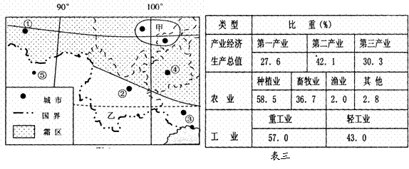 29.(14分)霜是指贴近地面的空气温度降低到0℃以下,空气中水汽凝结而形成的一种大气现象。结合下图“某地某年1月1日无霜区的分布图”和表三“图中甲区域经济结构”,回答下列各题。