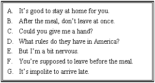 A: Well, it’s important to be on time when you’re invited for dinner. 84______ Americans expect their guests to be on time.
