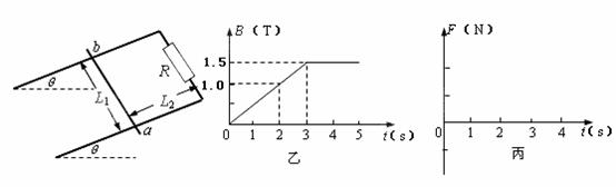 21.(18分) 如图甲所示,两根足够长、电阻不计的光滑平行金属导轨相距为L1=1m,导轨平面与水平面成θ=30角,上端连接阻值R=1.5Ω的电阻;质量为m=0.2kg、阻值r=0.5Ω的金属棒ab放在两导轨上,距离导轨最上端为L2=4m,棒与导轨垂直并保持良好接触。整个装置处于一匀强磁场中,该匀强磁场方向与导轨平面垂直,磁感应强度大小随时间变化的情况如图乙所示。为保持ab棒静止,在棒上施加了一平行于导轨平面的外力F, g=10m/s2求: