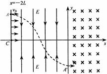 (20分)如图所示的直角坐标系中,第Ⅰ、Ⅳ象限内存在着垂直纸面向里的匀强磁场,在x=-2L与y轴之间第Ⅱ、Ⅲ象限内存在大小相等,方向相反的匀强电场,场强方向如图所示。在A(-2L,L)到C(-2L,0)的连线上连续分布着电量为+q、质量为m的粒子。从t=0时刻起,这些带电粒子依次以相同的速度ν沿x轴正方向射出。从A点射入的粒子刚好沿如图所示的运动轨迹从y轴上的A′(0,-L)沿x轴正方向穿过y轴。不计粒子的重力及它们间的相互作用,不考虑粒子间的碰撞