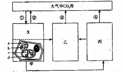 (1)《联合国气候变化框架公约》将“从大气中清除二氧化碳的过程、活动和机制”称之为“碳汇”,图能表示“碳汇”的过程是 (用图中数字序号表示),这一过程主要发生在甲图中 处(在a~d中选择)