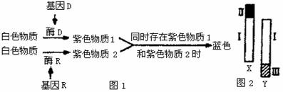 27.某自然种群的雌雄异株植物为XY型性别决定,该植物的花色(白色、蓝色和紫色)由常染色体上的两对独立遗传的等位基因(D、d和R、r)控制,叶形(宽叶和窄叶)由另一对等位基因(H和h)控制,请据图分析回答:(注:图l为该植物的花色控制过程。图2为该植物的性染色体简图,同源部分(图中的I片段)基因互为等位,非同源部分(图中的II、III片段)基因不互为等位)