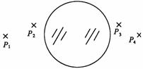 某同学用圆柱形玻璃砖做测定玻璃折射率的实验。先在白纸上放好圆柱形玻璃砖,在玻璃砖的一侧分别插上两枚大头针P1和P2,然后在玻璃砖的另一侧观察,调整视线使P1的像被P2挡住,接着在眼睛所在的一侧插两枚大头针P3、P4,使P3挡住P1、P2的像,使P4挡住P3和P1、P2的像,在纸上标出的大头针位置和圆柱形玻璃砖的边界如图所示。