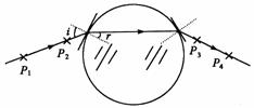 答案:光路如图,由图可知要测量玻璃的折射率,需要测量入射角i和折射角r,由折射定律得n =