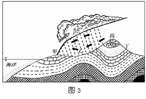 图3为“某地天气系统和地质构造示意图”。读图完成4-6题。