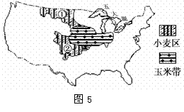 图5为“美国本土小麦区和玉米带分布示意图”。读图完成23-24题。