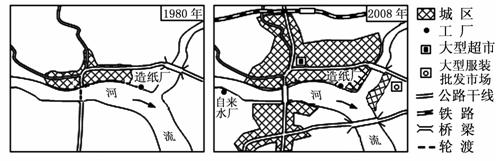[解析]此题要求学生能根据某城市1980年和2008年某地聚落空间形态变化示意图,分析判断该城市空间形态的变化及其成因。从图中可以看出,1980年以来,城市规模的扩大和形态的变化与城市桥梁、公路以及铁路的建设与布局有着密切的联系,由此判断该城市空间形态的变化原因是交通运输方式和布局的变化。本题属于中等难度题。