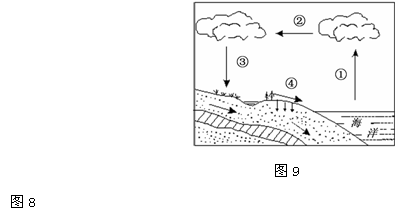 2008年入冬后,华北、黄淮等地旱情发展迅速。图8为“我国2009年春季某日旱情分布示意图”,图9为“海陆间水循环示意图”。读图完成16-19题。