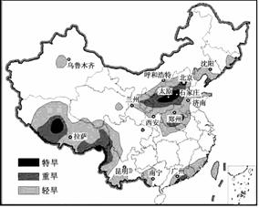 [解析]此题以2008年入冬后我国发生的大范围旱灾为情境,主要考查学生从图中获取和解析地理信息的能力。要求学生根据图中的图例读出地处特旱区的城市是太原和石家庄。本题属于基础题。