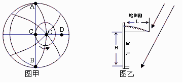 下图甲中,箭头为地球自转方向,O点为极点,C点是晨昏线AB与某纬线圈的切点,在C点观察北极星的仰角为71°,图中D点日出地方时为4:30。重庆(29°N、106°E)某住户窗户朝向正午太阳(图乙),窗体高度为H,窗顶遮阳棚宽度为L。根据题意回答6-7题。