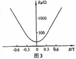 (4)某同学查阅相关资料时看到了图3所示的磁敏电阻在一定温度下的电阻一磁感应强度特性曲线(关于纵轴对称),由图线可以得到什么结论?