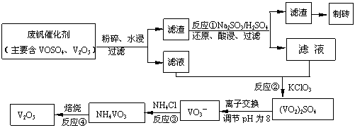 (2)为循环利用催化氧化所使用的催化剂钒触媒(V2O5),科研人员最新研制了一种离子交换法回收钒的新工艺,回收率达91.7%以上。已知废钒催化剂中含有V2O5、VOSO4及不溶性残渣。查阅资料知:VOSO4可溶于水,V2O5难溶于水,NH4VO3难溶于水。该工艺的流程如下图。