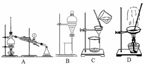 (1)从氯化钾溶液中得到氯化钾固体选择装置 (填代表装置图的字母,下同);除去自来水中的Cl-等杂质,选择装置 。