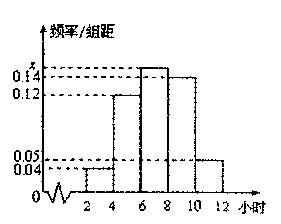 14.某校为了解同三同学寒假期间学习情况,抽查了100名同学,统计他们每天平均学习时间,绘成频率分布直方图(如图),则这100名同学中学习时间在6到8小时内的人数为 人。