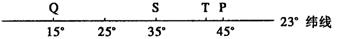 下图为一段纬线,P点以东是海洋,Q点以西是海洋,S和T之间为某一海域,其余为陆地,回答15-17题。