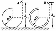 制成,B轨道由金属圆管制成,均可视为光滑轨道.在两轨道右侧的正上方分别将金属小球A和B由静止释放,小球距离地面的高度分别用hA和hB表示, 轨道的最高点都在圆心的正上方,则下列说法正确的是 ![]()
