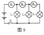 23.如图9所示的电路中,当闭合开关S时,电流表A1,A2,A3的示数分别是1.8A、0.9A、