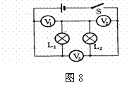 22.如图8所示,V1测量 两端的电压;V2测量 两端的电压;V3测量 两