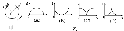 2、图甲为具有水平轴的圆柱体,在其A点放一质量为M的小物块P,圆柱体绕其有自身轴O缓慢地匀速转动.设从A转至A′的过程中,物块与圆柱体保持静止,则表示物块受摩擦力f大小随时间变化的图线是图乙中 ( )