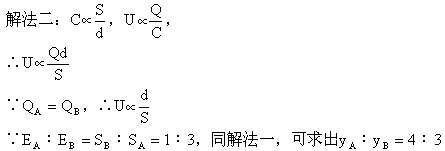 例17 有两个带电量相等的平行板电容器A和B,它们的正对面积之比SA∶SB=3∶1,板长之比∶LA∶LB=2∶1,两板距离之比dA∶dB=4∶1,两个电子以相同的初速度沿与场强垂直的方向分别射入两电容器的匀强电场中,并顺利穿过电场,求两电子穿越电场的偏移距离之比。
