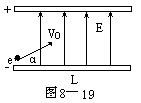 例21 如图8-19,一个电子以速度v0=6.0×106m/s和仰角α=45°从带电平行板电容器的下板边缘向上板飞行。两板间场强E= 2.0×104V/m,方向自下向上。若板间距离d=2.0×10-2m,板长L=10cm,问此电子能否从下板射至上板?它将击中极板的什么地方?