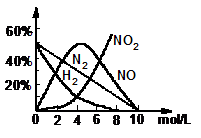 (2)上述方法制备的HNO3为稀HNO3,将它用水稀释或蒸馏、浓缩可制得不同浓度的HNO3。实验证明:不同浓度的HNO3与同一金属反应可生成不同的还原产物。例如,镁与硝酸反应实验中,测得其气相产物有H2、N2、NO、NO2,液相产物有Mg(NO3)2,NH4NO3和H2O。生成这些产物的HNO3浓度范围为:H2:C<6.6mol/L;N2和NH4+:C<10mol/L;NO:0.1mol/L<C<10mol/L;NO2:C>0.1mol/L。各气相产物成分及含量随HNO3浓度变化曲线如右图所示。