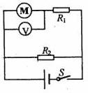 (8分)如图所示,电源电动势E=7.5V,内电阻r=1.0Ω,定值电阻R2=12Ω,电动机M的线圈的电阻R=0.5Ω。开关S闭合,电动机转动稳定后,电压表的示数U1=4V,电阻R2消耗的功率P2=3.0W。不计电动机的摩擦损耗等,求: