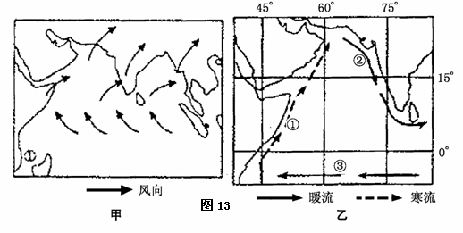 23.图13是印度洋(局部)季风和洋流示意图,读图回答下列问题。(10分)