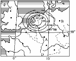 (1) 出发前,中国队员从网上查到: 图中所示的天气系统正在向正东方向运动,预计72小时将完全从B城过境,请你帮助他们预测B城未来72小时的天气变化过程。(3分)
