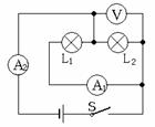 33、(3分)在右图所示电路中,闭合开关S后,电流表A1、A2的示数分别为0.38A和0.7A,电压表的示数为4.5V。(1)灯L1和L2的连接方式是什么?(2)求灯L2中的电流I2。(3)求灯L1两端的电压U1。