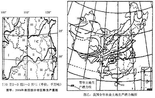 (2)比较图甲中A、B两省全年土地生产潜力的差异,并分析原因。