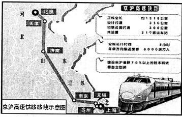 28.中国第一条具有世界先进水平的高速铁路--京沪高速铁路预计今年开工建设,并将于2010年投入运行。读下列图文资料回答。(13分)