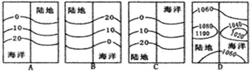 下列三幅等温线图和一幅等压线图(图2-7)中,表示北半球7月份的是 ( C)