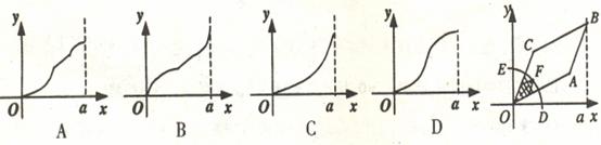 11、如图,圆弧型声波DFE从坐标原点O向外传播.若D是DFE弧与x轴的交点,设OD = x (0≤x≤a),圆弧型声波DFE在传播过程中扫过平行四边形OABC的面积为Y(图中阴影部分),则函数y = f(x)的图象大致是 ( )