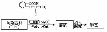 23.(2009学年丽水高中新课程水平测试高三化学试题)阿斯匹林是常用的解热镇痛药,其有效成分是乙酰水杨酸,结构如下图。欲测定阿斯匹林中乙酰水杨酸的含量,取1片药研碎,加入过量的0.01mol/L氢氧化钠溶液20.00mL使之充分水解;再用0.01mol/L盐酸滴定过量的氢氧化钠,消耗盐酸17.00mL。过程如下: