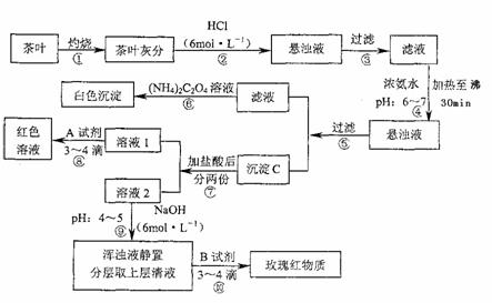 42.(苏、锡、常、镇四市2007年高三教学情况调查)茶是我国人民喜爱的饮品。某校化学兴趣小组的同学设计以下实验来定性检验茶叶中含有Ca、A1、Fe三种元素。
