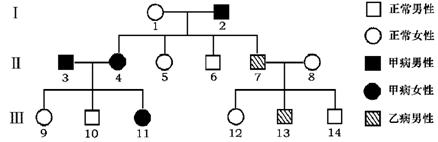 25.下图为甲、乙两种遗传病的家系图,其中乙病为伴性遗传病。如果Ⅲ11与Ⅲ13结婚,生一个患甲、乙两种遗传病的男孩的概率是: